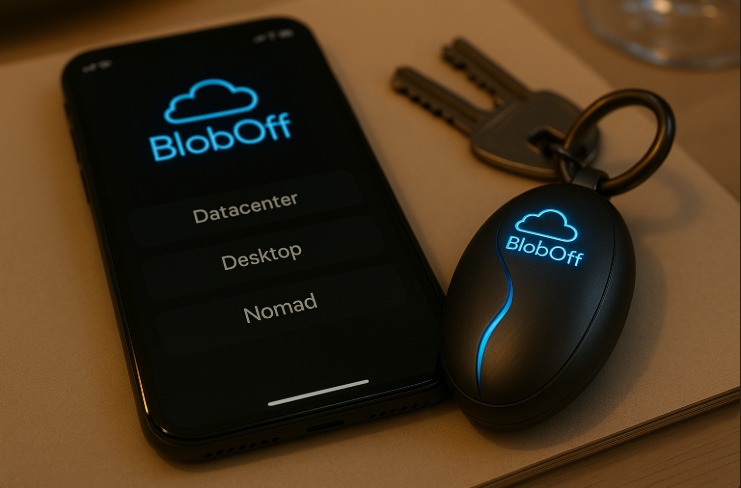 Attached to your keychain, the BlobOff Nomad connects you seamlessly to your Desktop and Datacenter — no passwords, no networks, no noise.